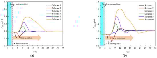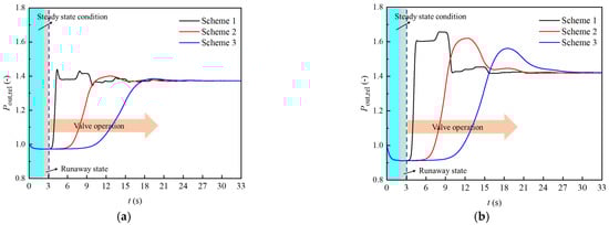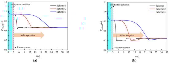 From the previous analysis, the turbine must not run for a long time after a runaway fault. The turbine must be timely cut off from the system, and the system pressure should be restored to the steady state before the runaway. Unlike the large tubular hydropower station, the turbine in this study is of fixed guide vane and paddle structure. Moreover, the shutdown process of the turbine is realized by operating the control valve on the pipeline. Closing the valve or opening the valve in a shorter time can easily lead to positive or negative water hammer in the system [34,35], which seriously threatens the safe operation of the system equipment.