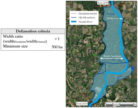 Our developed method differs from previous methods, e.g., [1,2,3], as we introduce two delineation criteria to identify the main active floodplains (with the highest retention effects): (i) ratio of widthFloodplain/widthChannel; (ii) minimum size. In a further step [49], we applied the Floodplain Evaluation Matrix (FEM), which requires delineated floodplains with a defined start- and endpoint. The two delineation criteria can vary and be adapted depending on the research question and the characteristics of the investigated river (e.g., basin size, river type). Considering our research intent and the characteristics of the Danube River, we set the width ratio to 1:1, meaning that an active floodplain starts if the width of the floodplain (excluding the main channel) is at least as wide as the channel width. If the width of the flooded area was smaller, then the area was defined as a riparian zone. In general, the width of the main channel was used for the ratio factor. An exception was the Eastern Wallachian Danube with the three largest islands (Balta Ialomita, Big and Small Islands of Braila), where the width of the respective largest branch was used. This was conducted because of the special characteristics of this section, where the side channels were considered as part of the river for several kilometers. In Figure 1, the applied delineation criteria for the Danube River are summarized, and an example of locating the start- and endpoint of a floodplain is presented.