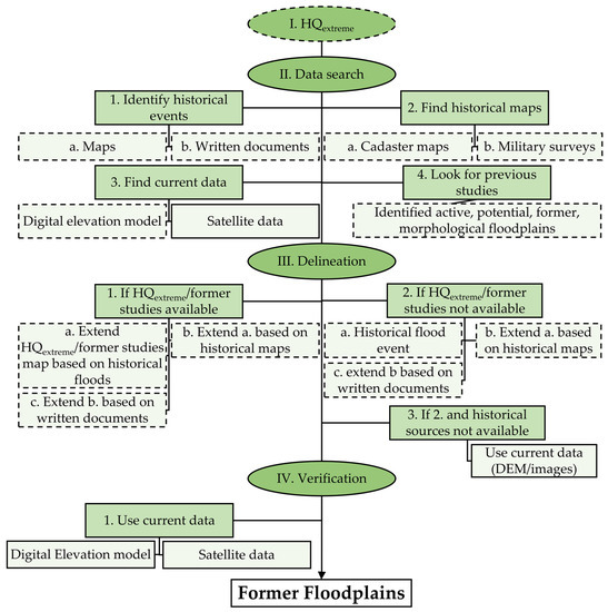 We define former floodplains as areas that have been cut off from the river due to river training and regulation, but that would have potentially been flooded without these human interventions. As in earlier literature [18,24], we use the term morphological floodplain to describe the combination of active and former floodplains. Delineating former floodplains that were hydraulically active during an extreme flood event is challenging because hydraulic processes in the river and floodplains have changed significantly due to strong human intervention. Using different sources ranging from historical documents (e.g., reports, military survey maps) to current hazard maps (e.g., outlines of HQextreme) and DEM allows the estimation of the former hydraulically active floodplains. As an innovative part of this work, we developed a schematic approach to identify former floodplains along four consecutive steps (Figure 2). Each step includes mandatory tasks, and leads to potentially different data sources, as each river is described through different data sets. Therefore, the presented method is structured in a way that allows it to be applicable, even when certain data (e.g., HQextreme) are not available.