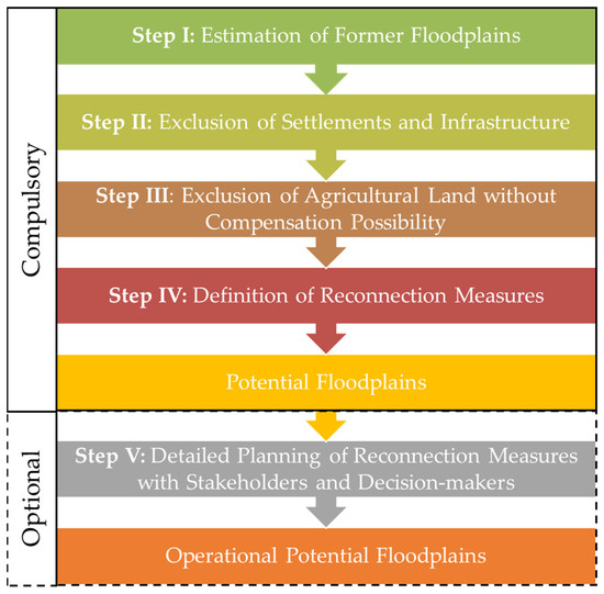 We define potential floodplains as areas that are currently not inundated by an HQ100 event, but have the potential (from a hydraulic, ecological, and socio-economic perspective) to be reconnected to the river system, leading to inundation during flood events with a 100-year return period. A step-by-step approach based on hydraulic and historical data was developed to identify potential and “operational” potential floodplains. The method is organized along five consecutive steps (Figure 3), with the option to exclude the last step V, which leads to the “operational” potential floodplains that have already been discussed in detail (regarding technical, political, and economic feasibility) among stakeholders, decision makers, and experts. The first four steps are compulsory, and sufficient to identify potential floodplains of a river. Depending on the individual project or research question, it might be necessary to include and apply step V (Detailed Planning of Reconnection Measures with Stakeholders and Decision Makers). To meet our objectives and answer our research questions, it was sufficient to apply the first four steps of the method, which led to the potential floodplains.