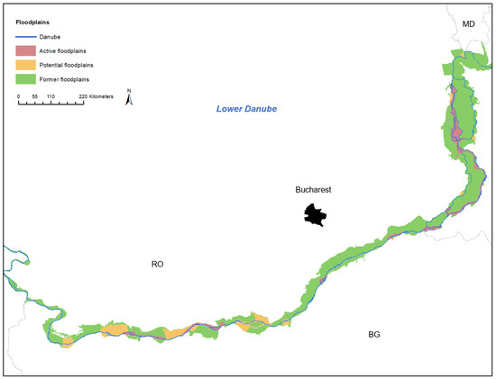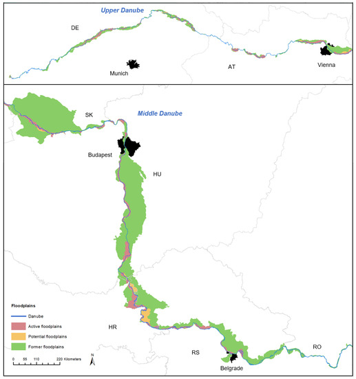 Floodplains are a fundamental source of multiple functions and services [1,2,3,4]. During overbank flooding, water is temporally stored in the floodplain, leading to the deceleration of the flood wave and reduction in the flood peak. Hence, floodplains contribute to mitigate flood risk in riparian areas [5,6,7], a characteristic that will be even more important in the future, as climate change is expected to increase flood and drought magnitude and frequency of occurrence. During droughts, floodplains slowly release stored water, reducing the impact of dry seasons [8]. Moreover, floodplains provide important ecological and recreational services [2]. They are very prolific habitats, even more than their neighboring river and uplands, due to their exchange with lateral and upstream sources (e.g., nutrient-rich sediments) [9]. This leads to high biodiversity (floodplains are the habitats of many Europewide endangered species), productivity (agriculture, fishery, pasture land), regulation processes (climate, nutrients, flood events), recreational and aesthetic values, and corresponding economic importance [2,9,10,11,12,13]. The sum of ecosystem service provisioning is greater in natural systems [1,14]. Therefore, scientists, governments, and the public are currently increasing their interest in floodplain habitats and their restoration [10]. This interest corresponds with the urgent need to maintain and restore floodplains and their vegetation, hydrologic dynamics, and sediment transport capabilities [9]. Human modifications of river morphologies, and our activities on floodplains, have led to a dramatic reduction in the extent of formerly flooded areas [9,15,16]. The reasons for this are manifold: floodplains are extremely attractive for agricultural cultivation and urban development due to their soil fertility, low topographic slope, and water availability [6]. The technical achievements of the industrial revolution allowed large-scale engineering work, such as river training and drainage systems, leading to an intensified usage of the flood-prone areas for agriculture and urban development [17]. In fact, Europe and North America have faced a loss of up to 90% of former floodplains [9,16]. Regarding the Danube area, previous studies report a loss of around 70% along the Danube River, and up to 80% in the Danube Catchment [18,19]. The Middle and Lower Danube sections have lost 75% and 72% of their morphological floodplains, respectively, excluding the Danube Delta [20].