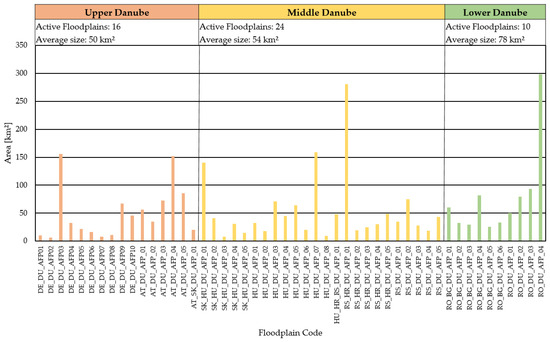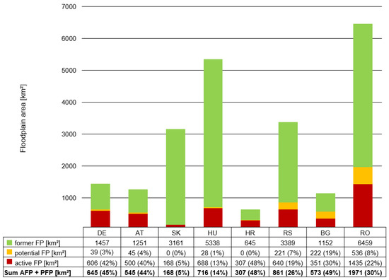 Fifty hydraulically active floodplains (without the Danube Delta) meet the two delineation criteria described in Section 2.3.1. We assigned these 50 floodplains to the 1st group of floodplains, which are evaluated in more detail in Eder et al. [49]. These 50 floodplains cover 3027 km2, which is about 64% of the total area (4711 km2) inundated during an HQ100 event. A total of 101 active floodplains are smaller than 500 ha, and were assigned to the 2nd group of floodplains. Most of them (58) are found in Baden-Württemberg, where the river width is relatively small, and therefore, the first criterion (ratio factor of widthFloodplain/widthChannel > 1) was easy to fulfil. With 375 km2, the floodplains in the 2nd group account for only 8% of the total inundated area. The 3rd group includes the riparian zones, where the two delineation criteria (ratio factor, minimum size) are not fulfilled. The riparian zones cover 1309 km2, which is about 28% of the total area inundated during an HQ100 event. Romania has the largest share of the 3rd group, with 43% (561 km2).