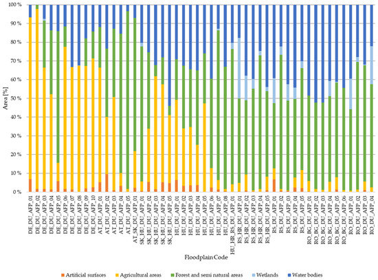 The CORINE land cover data set from the Copernicus database was used to analyze the land use of each active floodplain. The data set summarizes the land cover at the first level into five categories: “Artificial surfaces”, “Agricultural areas”, “Forest and semi-natural areas”, “Wetlands”, and “Water bodies”. Appendix A reports all the land use categories and subcategories of the CORINE land cover data set.