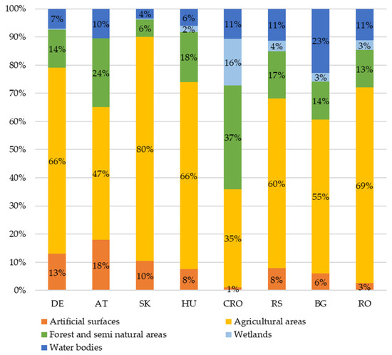 In total, 4711 km2 (see Table 3) of hydraulically active floodplains were identified (incl. main river channel and excl. the Delta), with Romania having the largest share of 30% (around 1435 km2). Hungary, Serbia, Germany, and Austria have a relatively large share between 11–15%, and 6 and 7% of the active floodplains are located in Croatia and Bulgaria, respectively. The share of Ukraine and Moldova is relatively low, especially since the Danube Delta is not considered in this estimation (due to its unique characteristics). However, with an area of 3394 km2, the Danube Delta is the largest wetland along the Danube River, and its importance for ecology is immense.
