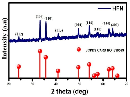 The X-ray diffraction (XRD) pattern of the prepared FNH nanoparticles using iron nitrate precursors is depicted in Figure 1 All the obtained diffraction peaks of hematite α-Fe2O3 matched well with the JCPDS file number 85-0599 [27]. This indicates the formation of single-phase hematite α-Fe2O3 nanoparticles. The average crystallite size of the samples was determined using Scherer’s formula, and was found to be around 32 to 42 nm. The lattice parameters of all the samples were well matched with the published report [27].