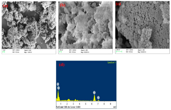 (a–c) FESEM image of prepared FNH nanoparticles at lower and higher magnifications and (d) EDAX spectrum of FNH nanoparticles.