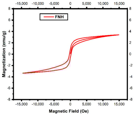 The magnetization curve for hematite nanoparticles is shown in Figure 3 with the M-H curve of the FNH nanoparticles. The observed values of retentivity (Mr), coercivity (HC), and the saturated magnetization (MS) of the FNH samples are listed in Table 1, along with the earlier available results in the literature, which observed a decrease in Fe-Fe interatomic bond distance and the volume of the unit cells. The magnetic phenomenon can be explained in terms of mean field theory; according to this theory, the distance between two magnetic ions, if larger than their sum of ionic radii, interacts ferromagnetically as the distance reduces between these ions, their ferromagnetic interaction is suppressed, and antiferromagnetic interactions are enacted [29,30,31,32,33,34]. The values of the bond lengths between Fe-O, O-O, and Fe-Fe are shown in Table 1, showing that the formation of iron oxide is ferromagnetic in nature compared with previous iron oxide magnetic insights.