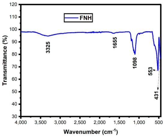 The formation of chemical bonds in the samples was confirmed using FTIR spectroscopy. Figure 4 reveals the FTIR spectra of the prepared FNH sample. The results show forcible absorption bonds around 553 and 431 cm−1 with slightly different magnitudes. These bands represent characteristic features of hematite and correspond to metal oxide stretching vibrations. The high-frequency band at around 553 cm−1 refers to Fe-O deformation in the octahedral site, and Fe-O deformation in tetrahedral site is revealed from the frequency band at around 433 cm−1 [35]. At last, the 1098 cm−1 band present in the FNH sample corresponds to the presence of C-O bond stretching in the C-O-C group in the anhydro glucose ring due to glucose content [36].