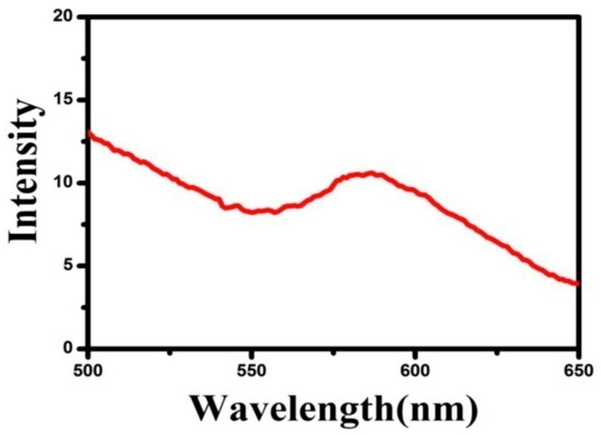 The photoluminescence of the prepared α-Fe2O3 nanoparticle is shown in Figure 5. The intense and sharp emission band around 590 nm indicates the edge emission and corresponds to the optical absorption. The enhanced neighboring Fe3+ magnetic coupling is due to the change in the atomic oxygen coordinates in the nanosized α-Fe2O3 lattice [37]. This is also due to the increase in Fe–O bonding separation, which is also responsible for photoluminescence. The PL peaks around 590 nm may also be due to the surface defects which may arise from the deep traps created due to iron vacancies. The PL spectrum of α-Fe2O3 exhibits a broad band centered at 590 nm that shifts to a slightly higher energy compared to the previously reported α-Fe2O3. As a result, the PL spectrum of the synthesized α-Fe2O3 nanoparticle shows no recombination mechanism.