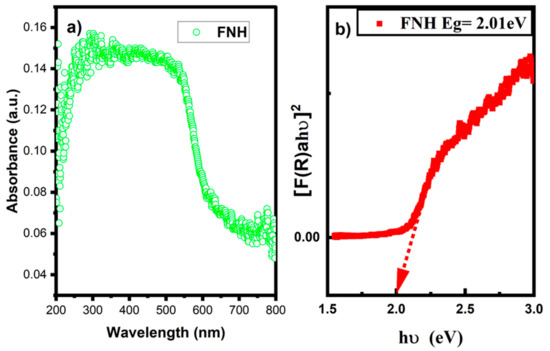 (a) UV absorbance and (b) Tauc plot of FNH nanoparticles.