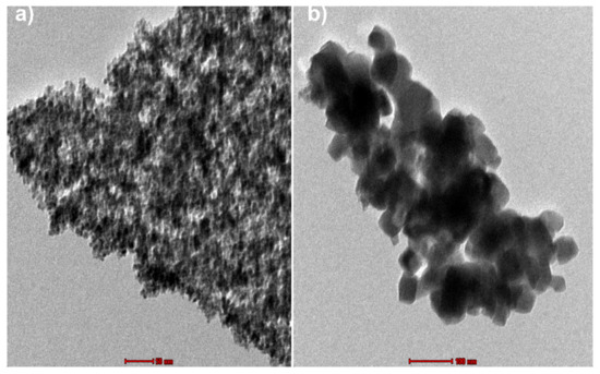 The green synthesized α-Fe2O3 (FNH) nanoparticles’ transmission electron microscopic images are displayed in Figure 7a,b. Various magnifications are presented in FNH nanoparticles and their magnifications are 50 nm and 100 nm. Figure 7a demonstrates the accumulation of spherical particles on the surface. The aggregation and accumulation of a large number of particles result from the honey biomolecules [42]. The existing honey molecules create the agglomerations on the surface and form the accumulation for the derived shapes. The spherical FNH samples are evident in Figure 7b. The spherical shape of the nanoparticles reveals the improved photocatalytic degradation activity and bacterial deactivations [43,44]. The spherical-shaped FNH nanoparticles are at a size of around 31 nm. The obtained particle size values are nearly equal to the crystallite size of the FNH nanoparticles.