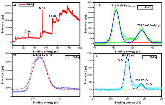 The XPS spectrum aids in determining the valency and bonding between the materials and binding the energy of the synthesized nanoparticles. Figure 8 presents the XPS wide, Fe-2p, O-1s and C-1s spectrum of the FNH nanoparticles. The wide spectrum of the FNH samples derives from the elements of Fe, O and C from the synthesized FNH nanoparticles (Figure 8a). The Fe-2p spectrum denotes the valency of the Fe elements in the 2p state and their binding energies are 711.4 eV (Fe-2p3/2) and 724.5 eV (Fe-2p1/2). Fe2+ and Fe3+ were stabilized from the honey bio-derivatives. The honey compounds reduced the iron to zero valency [45]. The oxygen attachment on the Fe increased the surface area and reduced electron trapping. Lattice oxygen peaks were present at 531, and 15 eV represents the O-1s state which formed the Fe-O bonding and confirmed the FN nanoparticles of α-Fe2O3 [46]. The carbon peak for the FNH nanoparticles was obtained from the 284.75 eV and 288.97 eV binding energies, representing C-O and C=O at the O-1s state. Carbon attribution on the FNH nanoparticles confirms the honey molecules’ interaction with the Fe and O elements [47,48,49]. The obtained XPS results show the Fe and O elements and their bonding and reduction/stabilization confirmation from the honey molecules.