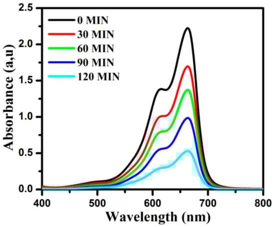 The photocatalytic degradation of MB dye using simulated solar radiation. To carry out the reaction, initially, 50 mL of MB (1 × 10−5 mole and pH = 6.15) was taken in a 250 mL beaker. The distance between the simulated light and the beaker was almost 10 cm. About 0.05 g of photo catalyst was added to the solution and kept in the dark for 2 hrs to reach the adsorption and desorption kinetics. After 2 h, the solution was placed in simulated solar radiation with continuous stirring at an RPM of 550. Then, the solution was withdrawn at 10 min intervals, centrifuged, and the rate of the degradation of the dye was measured using a spectrophotometer of MB.