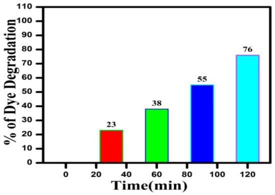 The photocatalytic dye degradation of α-Fe2O3 nanoparticles prepared using honey is depicted in Figure 9. Simulated solar radiation acts as the energy source of photo degradation. The light source modifies the valence band energy and conduction band energy in the dye-mediated α-Fe2O3 nanoparticles. The excited electrons are separated by source materials during the excitation process. Simultaneously, the same amount of holes are captured by the valence band. The α-Fe2O3 nanoparticles exhibited strong degradation at the initial 30 min. The light addition to the catalyst and dye solution resulted in photogenerated charge carriers [50]. The photogenerated charge carriers produced the enhanced photocatalytic activity towards the MB dye solution. At 120 min, the MB dye degraded to 76 percent of the α--Fe2O3 nanoparticles synthesized using honey. The degradation efficiency, as shown in Figure 10, indicates the possible mechanism of α-Fe2O3 nanoparticles in MB dye degradation, and their values compared with previous work are displayed in Table 3. Initially, the light irradiation to the α-Fe2O3 nanoparticles produces the electron-hole pairs. Then, the electrons are occupied by the conduction band and holes are occupied by the valence band. The holes and electrons produce O2−and OH. radicals for the mineralization of the organic molecules [51,52]. These super oxides and hydroxyl are responsible for the degradation of the methylene blue dye. The degradation mechanism is shown in Figure 11, and its equation is as follows.