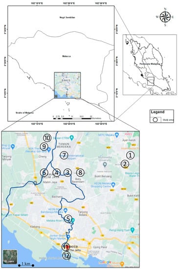 Map showing sampling sites in the Malacca area. Note: The sampling map was remade based on google.com/maps (accessed on 18 July 2022).