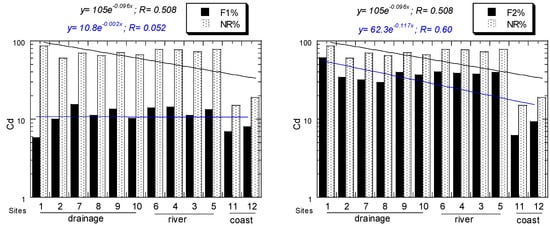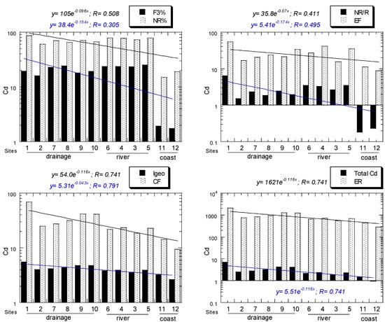 For Cd, all NR/R ratios of all sites ranged from 0.18 to 6.37. For Cd, all EF values of all sites ranged from 8.71, “significant enrichment”, to 54.3, “extremely high enrichment”. For Cd, all Igeo values of all sites ranged from 2.65, “moderately polluted to strongly polluted”, to 5.52, “very strongly polluted”. For Cd, all CF values of all sites ranged from 9.43, “very high”, to 68.7, “very high”. For Cd, all ER values of all sites ranged from 283, “high potential ecological risk”, to 2062, “very high ecological risk”. All the above Cd values decreased from the drainage to river and coastal sediments (Figure 2).