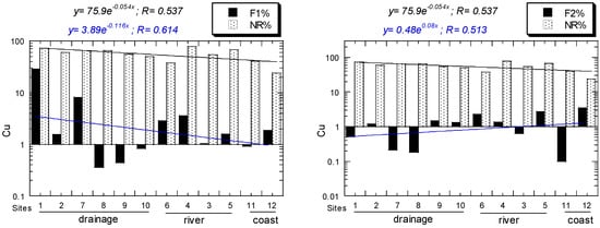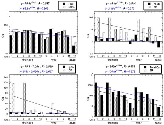 For Cu, all NR/R ratios of all sites ranged from 0.32 to 2.62. For Cu, all EF values of all sites ranged from 0.52, “depletion of metal enrichment”, to 92.4, “extremely high enrichment”. For Cu, all Igeo values of all sites ranged from −1.42, “practically unpolluted” to 6.30, “very strongly polluted”. For Cu, all CF values of all sites ranged from 0.56, “low”, to 118, “very high”. For Cu, all ER values of all sites ranged from 2.81, “low potential ecological risk”, to 591, “very high ecological risk”. All the Cu values above decreased from the drainage to river and coastal sediments (Figure 3).
