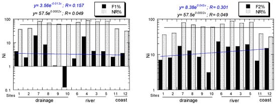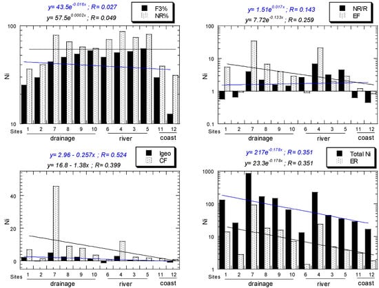 For Ni, all NR/R ratios of all sites ranged from 0.45 to 3.94. For Ni, all EF values of all sites ranged from 0.83, ”depletion of metal enrichment”, to 34.2, "very high enrichment". For Ni, all Igeo values of all sites ranged from −0.75, "practically unpolluted”, to 4.93, “strongly to very strongly polluted”. For Ni, all CF values of all sites ranged from 0.89, "low", to 45.70, "very high". For Ni, all ER values of all sites ranged from 1.79, "low potential ecological risk", to 91.4, "considerable potential ecological risk". All the above Ni values decreased from the drainage to river and coastal sediments (Figure 4).