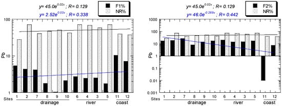 For Pb, all NR/R ratios of all sites ranged from 0.59 to 2.40. For Pb, all EF values of all sites ranged from 1.75, "depletion of metal enrichment", to 13.5, "significant enrichment". For Pb, all Igeo values of all sites ranged from 0.34, "practically unpolluted", to 3.59, "strongly polluted". For Pb, all CF values of all sites ranged from 1.90, "moderate", to 18.1, "very high". For Pb, all ER values of all sites ranged from 9.47, "low potential ecological risk", to 90.3, "considerable potential ecological risk". All the above Pb values decreased from the drainage to river and coastal sediments (Figure 5).