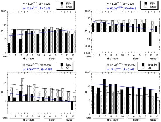 Pb percentages of "easily, freely leachable or exchangeable" (F1; %), "acid-reducible" (F2; %), "oxidisable-organic" (F3; %), and non-resistant (%) fractions, ratios of non-resistant to resistant fractions (NR/R; unitless), enrichment factor (EF; unitless), geoaccumulation index (Igeo; unitless), contamination factor (CF; unitless), total Pb concentrations (Total Pb; mg/kg dry weight), and ecological risk (ER; unitless) of Pb. Note: hyphen (-) means minus.
