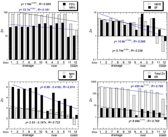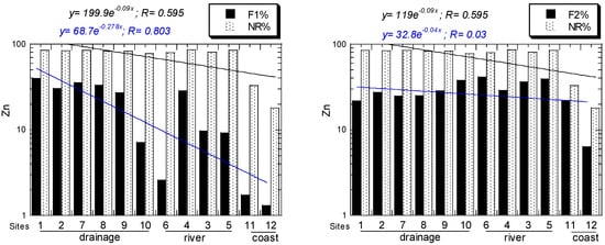 For Zn, all NR/R ratios of all sites ranged from 0.22 to 5.60. For Zn, all EF values of all sites ranged from 0.62, "depletion of metal enrichment", to 4.74, "moderate enrichment". For Zn, all Igeo values of all sites ranged from −1.16, "practically unpolluted", to 2.00, "moderately polluted to strongly polluted". For Zn, all CF values of all sites ranged from 0.67, "low", to 6.00, "very high". For Zn, all ER values of all sites ranged from 0.67 to 6.00, which both are under the category of "low potential ecological risk". All the above Zn values decreased from the drainage to river and coastal sediments (Figure 6).