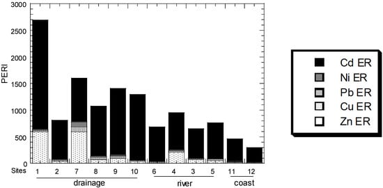 The comparison of PERI values in the drainages, river, and coast are presented in Figure 7. The PERI values ranged from 814 to 2695 (mean: 1482), 614 to 955 (mean: 764), and 298 to 465 (382), for the drainages, river, and coast, respectively. Overall, the PERI values were contributed to mainly by the ER of Cd. Therefore, the drainages and river were categorised as "very high ecological risk" (PERI ≥ 600), according to Hakanson [34]. This clearly showed that the major sources of anthropogenic inputs came from the two areas before being emptied into the coastal area.