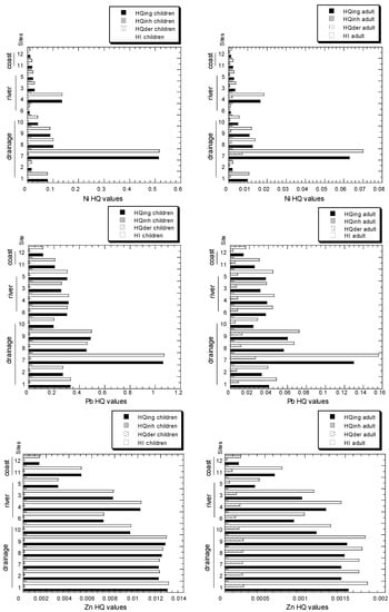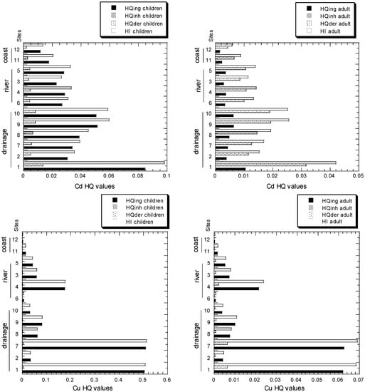 Thirdly, the HQ values for the various routes of exposure were as follows: ingestion > dermal contact > inhalation. This is consistent with findings from various land uses in Peninsular Malaysia [4]. It was determined that exposure to Cd, Cu, Ni, Pb, and Zn decreased in the following order for children and adults: ingestion > skin contact > inhalation. Gu et al. [20] observed that the percentage of the contribution of intake of HI levels varied between 77.9 and 99.1% for children and between 71.0 and 98.7% for adults.