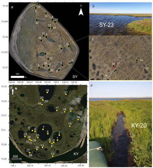 Sample points at the Samoylov ((a)—orthophoto map) and Kurungnakh ((d)—Landsat satellite image) Islands, Star Water body on the Samoylov Island (b), interpolygonal pond SY-23 (red line), and small ponds SY-24 and 25 in the near-central part of the Samoylov Island ((c)—fragment of the orthophoto map), watercourse KY-20 (e) flowing from the alas water body KY-19 on the Kurungnakh Island. SY and KY—abbreviation for sample points on Samoylov and Kurungnakh Island, respectively.