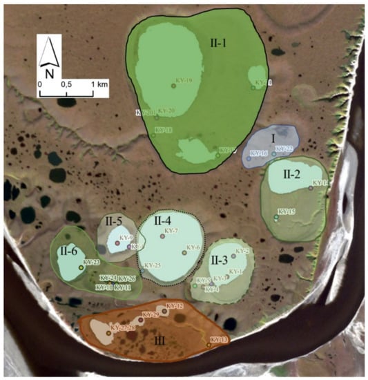 There are a lot of recent investigations which aim to detect landscape changes and erosion processes in permafrost regions by using remote sensing [,,,,,,,]. Already today, there are methods for processing images that make it possible to judge the degree of permafrost degradation. []. Our hypothesis is based on the consideration that different mobility of chemical elements leads to their redistribution in the course of permafrost degradation. Therefore, the bottom sediments of the water bodies water body, based on landscape areas with different degrees of degradation, will be characterized by the accumulation of marker elements.