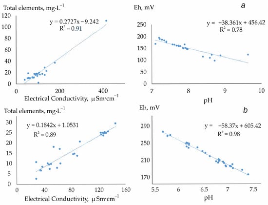 The specific electrical conductivity (EC) of the water body waters on Samoylov Island varies in a wide range from 39 to 415 μSm∙cm−1(Figure 3a), and the total concentration of chemical elements from 9 to 110 mg∙L−1. The relationship of conductivity with the sum of the elements is shown in the graph (Figure 3a). The pH values vary in the range of 7.40 to 9.63, and the ORP values from 97 to 178 mV. Physical and chemical conditions correspond to the conditions typical for freshwater body waters in contact with the atmosphere. The water in the polygonal ponds has an EC of about 20–30 µSm/cm, the lowest in the comparison with other water bodies, while thermokarst (merged polygons) and oxbow water bodies are characterized by higher mineralization (close to the mineralization of the Lena River). The highest EC (415 μSm∙cm−1) is in watercourse 1 (Figure 1a), which is seasonally flooded by the river waters. At the time of testing, the water is stagnant, sediments silted up, and conditions for the accumulation of chemical elements are created. Manganese and iron concentrations are also highest among all the sampled points.