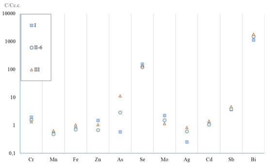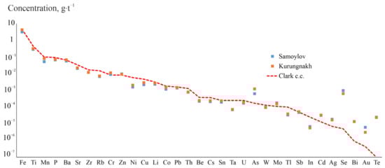 When comparing the concentrations of the elements in the bottom sediments of the islands with average concentrations of these elements in the earth’s crust (Clark), a number of anomalies are revealed: in Cd, Ag, As, Mo, Se, Bi, Au, Te (Figure 4). The concentration of As in the bottom sediments of water bodies of the Samoylov Island is 0.0006 g·t−1, Kurunghnakh Island—0.0012 g·t−1 and clark in the continental crust is 0.00017 g·t−1. So, the anomalie for As is 3.7 in Samoylov waterbodies and 7.2—in Kurungnakh. The anomalies for Mo, Cd and Ag in the Samoylov and Kurungnakh waterbodies are equal to 1.6 and 1.4; 2.4 and 2.5; 2.7 and 2.4 correspondingly. The concentrations of Se in bottom sediments are higher than clark in 195 and 127 times in Samoylov and Kurungnakh waterbodies correspondingly. Anomalies for Bi and Au are equal to 15 for both Islands. The most significant excess corresponds to Te, which has a higher concentration than clark by 240 times.