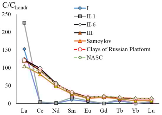 Distribution of normalized to the chondrite concentrations of rare earth elements (REE) in sediments of water bodies on the surface of Yedoma (group I, waterbodies with altitudes 45 m) and in the water bodies of the first stage of degradation of permafrost (II-1, waterbodies with altitudes 25 m) is identical and differs from the distribution of rare earth elements in other studied objects (Figure 6). Distribution of REE in the bottom sediments in the waterbodies of group II-6 (water bodies on the third geological terrace with altidues 8–10 m), group III (late stage of the permafrost degradation, first geological terrace, waterbodies with altitudes 8 m) and Samoylov Island are identical and correspond to distribution in Clays of the Russian platform and North American Shale Composite (NASC) [] (Figure 6).