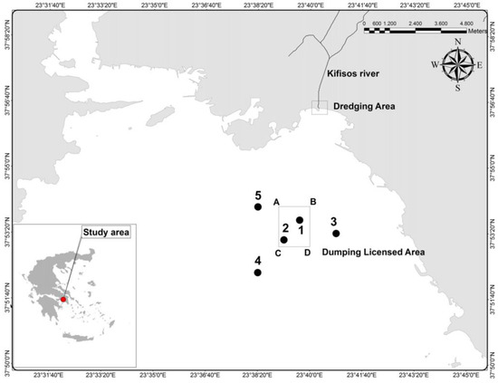 The coastal area of the licensed dumping site and the adjacent area were monitored before, during and post dumping for 27 months (April 2010 to June 2012). The area was also studied systematically during the previous years, thus the baseline status of the area was well known and totally coincided with the findings of the sampling in April 2010, just before the beginning of the dumping operations (e.g., [22,23,24]). A network of five stations (DSS1 to DSS5; Table 1) was monitored monthly during that period with the HCMR R/Vs ALCYONE and AEGAEO. Two stations (DSS1, DSS2) were located at the sediment disposal area (rectangle ABCD in Figure 1) and three stations (DSS3, DSS4 and DSS5) in the adjacent area.