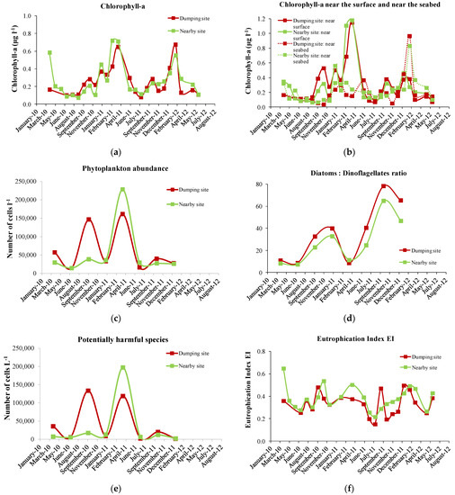 The distributions of Chlorophyll-a (Chl-a) and phytoplankton abundance during the dumping monitoring survey are presented in Figure 3a–c. Chl-a peaked during late winter–spring (February–April) at all sites and phytoplankton abundance showed a similar distribution pattern. The Chl-a peak was shaped in the surface layer after the first year of dumping operations (1.181 μg L−1 in March–April 2011), whereas after two years of dumping operations the Chl-a peak was shaped near the seabed (0.967 μg L−1 in February 2012).