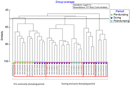 In order to examine the evolution of the phytoplankton community structure over the three periods before, during and after the dumping operations, a cluster analysis was performed. In the Cluster graph (Figure 4), the phytoplankton community structure shaped one cluster for the periods of pre-dumping and early-dumping from April to October 2010, which was clearly separated from the rest. During and after the dumping operations, some of the autumn and winter months formed one cluster, whereas the spring and summer months formed two other separate clusters.