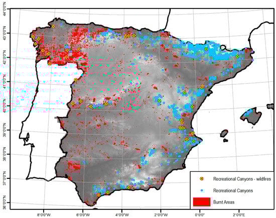 Documented wildfires (red areas) in the Iberian Peninsula (from EFFIS, Copernicus EC, https://effis.jrc.ec.europa.eu/; accessed on 26 June 2022) together with main recreational canyons in blue dots (Source: https://infobarrancos.es/; accessed on 26 June 2022). Yellow dots are canyons affected by recent wildfires.