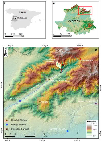 (A) Location map of the study area into the Spain country, and Caceres Province (B). (C) Map of the study area with location of the stations used in rainfall estimation (red triangles), gauge station at El Torno in Jerte river (blue) and the two canyons marked by red stars at the flash flood arrival point.