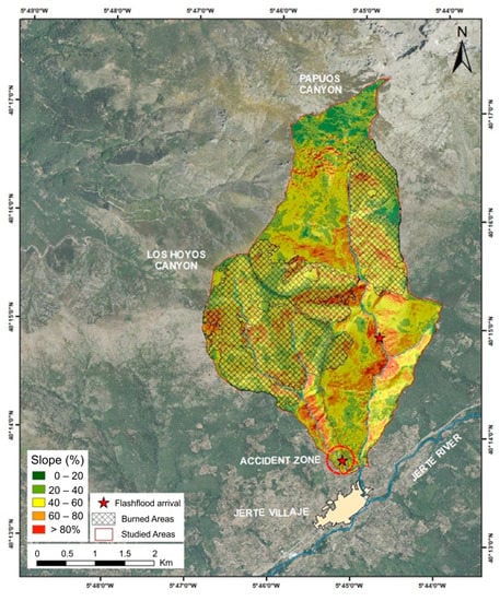 The main objectives of this work are to determine the main reasons for this flash flood accident, to establish its relationship with the previous wildfire, and to determine hidden factors that might have accounted for this extreme sensitivity to environmental changes. Our hypotheses are: (i) the real rainfall was underestimated by rainfall stations due to the mountainous nature of the area, (ii) a previous wildfire provided enough trees to create log dams that failed and broke under small storms, and/or (iii) wildfires have changed the infiltration pattern of the soil, and thus, the runoff exceeded the normal rate for a small storm.