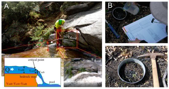 (A) Fieldwork hydrological measurements in Papúos canyon, recording the critical flow depth along a step. The lower picture shows the same point during peak flow downstream at the P-3 point. (B) Infiltration test using the single ring method. (C) Sample of burned soil in the infiltration ring, with ashes still present two years after the wildfire.
