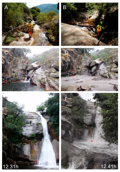 Pictures of the canyons studied. (A) A frequent open section in Hoyos canyon. (B) Site of accident in Hoyos canyon. (C,D) Papúos canyon before and after the flash flood. (E,F) The large waterfall where the flash flood arrived (10-min difference). Red stars point out the same positions.