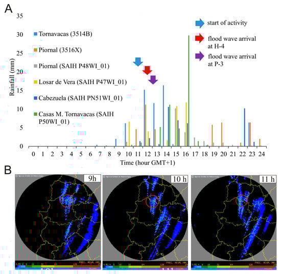 (A) Rainfall of the 2017 event at Jerte valley stations (Source: SAIH Tajo). (B) Radar rainfall data from 9:00 to 11:00 (GMT + 1) (source: AEMET). Colored arrows indicate the start of activity (blue) and the flood wave’s arrival at Hoyos and Papúos.