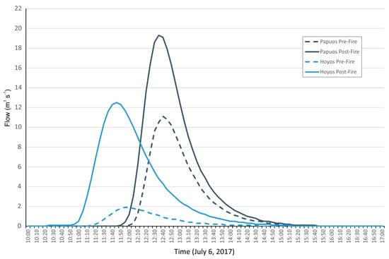 The HEC-HMS model for the Hoyos basin divides it into three sub-basins, which were not affected to the same extent by burning. Estimated pre- and post-fired CN mean values for the basin increased from 65.36 to 82.56 (Table 4), respectively, although the changes due to fire were more intensive in the two upper sub-basins (with CN mean value changes from 62 to 84). The CN values for burned areas follow the proposed values of Yochum and Norman [21]. These changes in CN values give rise to changes in outflow rates, so the peak flow value in the pre-fire scenarios does not reach a value of 2 m3 s−1, while in the post-fire scenario this value increased to 12.5 m3 s−1 (an increase of 658%; see Figure 7). In the Papúos basin model, up to 11 sub-basins were defined, and the CN mean values for the whole basin changed from 71.18 to 78.08 when the post-fire conditions were considered. As for the Hoyos basin, there were major changes in some of the sub-basins in terms of the mean CN value (with some cases in which the CN value rose from 59 to 79). For the Papúos basin, the increase in the peak flow value was not as pronounced as in the Hoyos basin, with an outflow rate for the pre-fire scenario of 11.1 m3 s−1, while this value rose to 19.3 m3 s−1 for the post-fire scenario (an increase of 174%; see Figure 7). The results obtained with the HEC-HMS model showed that the effects of the fire not only caused an increase in the peak flow value associated with the 2017 rainfall event, but there was also an increase in flow velocity, directly associated with the increase in peak flow. Thus, the maximum flow velocities estimated for the study area in the Hoyos basin increased from 1.9 m s−1 to 3.75 m s−1—they practically doubled. In the case of the Papúos basin, the variations were not so important, and in both cases, the flow velocities reached were significant. In this case, the pre-fire situation showed maximum flow velocity values of 5 m s−1; in the case of the post-fire situation, this value increased to over 6 m s−1.