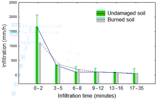 In spite of the similar texture and soil moisture conditions, the results for soil infiltration were significantly lower in the burned areas (Figure 8), although only for the first 2–3 min of the experiment. The infiltration rate became similar between burned and undamaged areas after 3 min. The steady state infiltration was around 58 ± 13 mm h−1 at the end of the experiment.