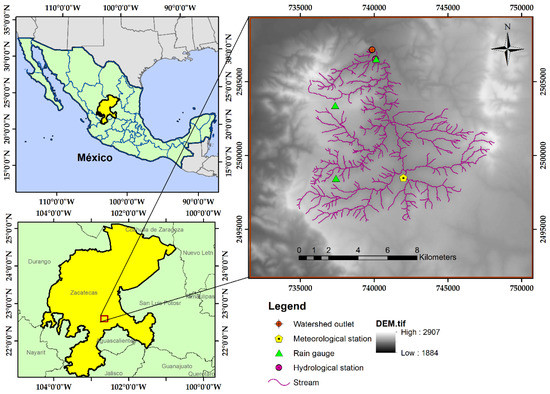 The watershed “Chilitas” is located in the center of Mexico, in the state of Zacatecas, 20 km south of the capital; it has an approximate area of 100 km2, as illustrated in Figure 1. The geographic coordinates of the centroid are approximately 22°39′17″ N and 102°39′57″ W, datum WGS84. It is a rural watershed with a population minor to 500 inhabitants distributed in two towns; no sewage is discharged into the streams and there are practically no reservoirs over the streams or appreciable depressions. Regarding the use and soil covering, 62.4% of the surface is natural pasture, 18.6% is dedicated to annual seasonal agriculture, 9.3% is crasicaule scrub, 4.2% is for annual agricultural watering, 3.6% is secondary shrub vegetation, 0.43% is urban construction, and less than 0.03% is pine forest. The predominant soil type is phaeozem, with 61.8% of the surface, followed by kastañozem with 32.5%, and 3.7% leptosol [48]. The climate is semi-arid, with rains in the summer, mainly from June to September [49]. The average maximum and minimum temperatures are 29 °C and −2.8 °C, respectively, with a mean precipitation of 428 mm per year; the values were obtained by the weather station installed in the watershed and were cross-match referenced with data from [50]. The study area features four rain gauges and two hydrometric stations (Figure 1). It is assumed that the watershed is possibly one of the groundwater recharge sites of the “Benito Juarez” aquifer, one of the most important aquifers in the region, hence the interest of study.