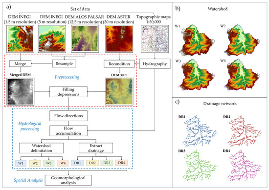 One of the most important components for understanding the behavior of natural resources in a watershed is geomorphometry. Through mathematical measurements and terrestrial surface processing, geomorphometry allows for knowing how drainage patterns function, as well as water conservation, sediment production, and the soil erosion state within a hydrological system [1,2,3,4]. With the geomorphological data, it is possible to generate hazard and flood risk maps [5], estimate flows for hydraulic purposes, and to analyze anthropogenic activity effects [6]. The hydrological, geomorphological and ecological processes of an environment are susceptible to the topographic surface [7,8,9]. In particular, the hydrological response of the watershed is significantly controlled by geomorphological parameters [10,11]. The surface and sub-surface runoff dynamics are intimately linked to the slopes and drainage networks of the watershed channels; the geomorphology mainly impacts the catchment area, the travel times, and the flow hydrogram changes [12]. Therefore, determining geomorphological parameters is crucial to generating accurate maps and modeling the water redistribution within the watershed [13].