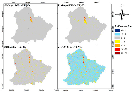 Difference of cell elevation in pre-treated DEMs against fill DEMs: (a) merged DEM–fill DEM J/D, (b) merged DEM–fill DEM W/L, (c) DEM 30 m–fill DEM J/D, and (d) DEM 30 m–fill DEM W/L.