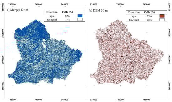 Raster maps were generated to analyze the differences in the direction of each cell, post the filling process. Figure 4 displays the areas with significant unequal directions (white zones) that coincide with the sites where the fill algorithms mainly affected the original DEM (flat reliefs). Flat reliefs were pointed out by Nardi et al. as generators of technical issues for identifying channels [45]. In the DEM 30 m (Figure 4b), 28.5% of the total area displayed unequal flow direction patterns, while the merged DEM (Figure 4a) resulted in 17.5% of the area with distinct flow directions. Engelhardt et al. [6] compared directions between original DEMs and smoothed or aggregated DEMs and found that resolution affects further than the type of algorithm selected, which coincides with the results of this investigation.