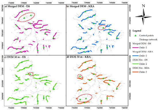 Regarding the stream order 2, the areas marked with a red dashed line within Figure 8 exhibit channels with erroneous stream order, demonstrating that routing and fill algorithms affect them significantly. The most critical differences in the number and length of channels resulted from applying the KRA algorithm to the filled DEM with the W/L algorithm, which corresponds with Table 7 and Table 8.