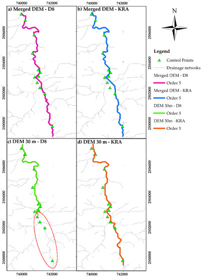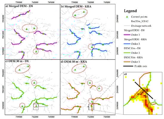 The accumulative length of the stream order 3 channels in Table 8 showed a small difference between D8 and KRA algorithms on a single resolution (0.1587 km in the merged DEM and 0.5852 km over the DEM 30 m). However, reviewing the channels of order 3 concerning the control points, the location of the channels was different in each scenario (see Figure 9). Some channels were identified under another order. The area marked within Figure 9c,d corresponds to the higher magnification image in Figure 9e, with the X-X’ axis. Cells most affected by the fill algorithms were included in Figure 9e.