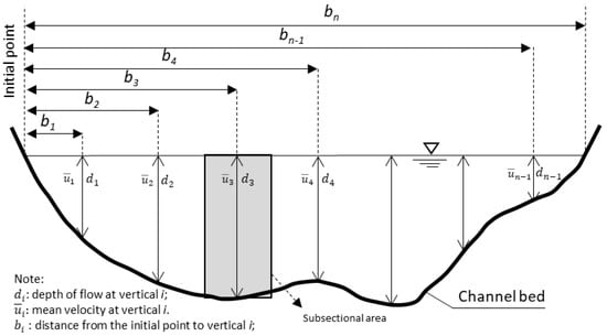 where bi is the distance from the initial point to vertical i; is the depth of flow at vertical i; and is mean velocity at vertical i. The observed discharge (Qobs) and cross-sectional area (Aobs) can be represented as (3) and (4), respectively: